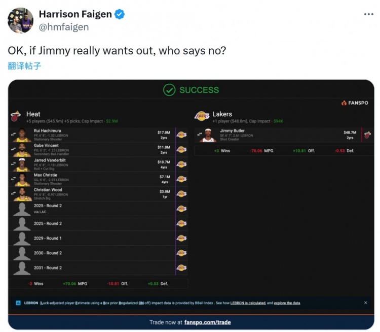 湖人隨隊(duì)記者Harrison Faigen曬出了自己的交易方案,湖人送出5名球員和5個(gè)選秀權(quán),具體如下:
