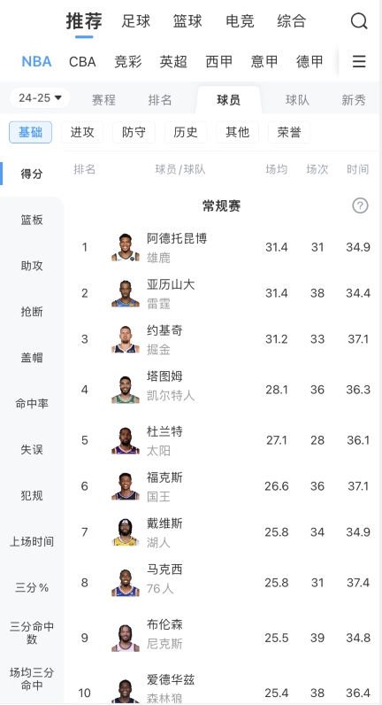 本賽季的得分王競爭激烈,目前字母哥(31.419)和亞歷山大(31.368)均為場均31.4分(小數(shù)點后一位),前者以微弱優(yōu)勢暫居榜首;約基奇場均31.2分排名第三。