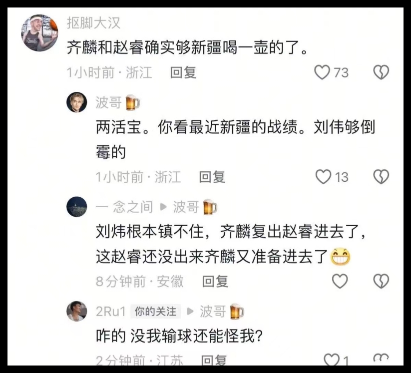 發(fā)布時間:2025年01月14日 17:50點擊:欄目:籃球新聞 01月14日訊 處在禁賽期間的趙睿不滿網(wǎng)友的抱怨,回懟球迷道:“咋的,沒我輸球還能怪我?”具體對話如下:趙睿此前因沖撞裁判被CBA官方禁賽五場,罰款10萬。目前五場禁賽期已過,趙睿有資格在今日新疆客場對陣江蘇的比賽中復出。 除特別注明外,本站所有內(nèi)容均為九球直播整理排版,轉(zhuǎn)載請注明出處:網(wǎng)友:齊麟&趙睿夠新疆喝一壺 趙睿:咋的 沒我輸球也怪我? 本文標簽: 籃球 CBA 中國籃球 新疆 趙睿