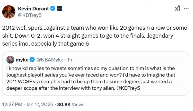 談到自己面對(duì)過最艱難的季后賽系列賽,杜蘭特回復(fù)道:“2012年西部決賽,面對(duì)馬刺,他們當(dāng)時(shí)好像20連勝了(在面對(duì)雷霆之前、馬刺常規(guī)賽+季后賽18連勝)。我們系列賽0-2落后開局,然后4連勝進(jìn)入總決賽。在我看來那是一個(gè)傳奇的系列賽,尤其是G6?!?/p>