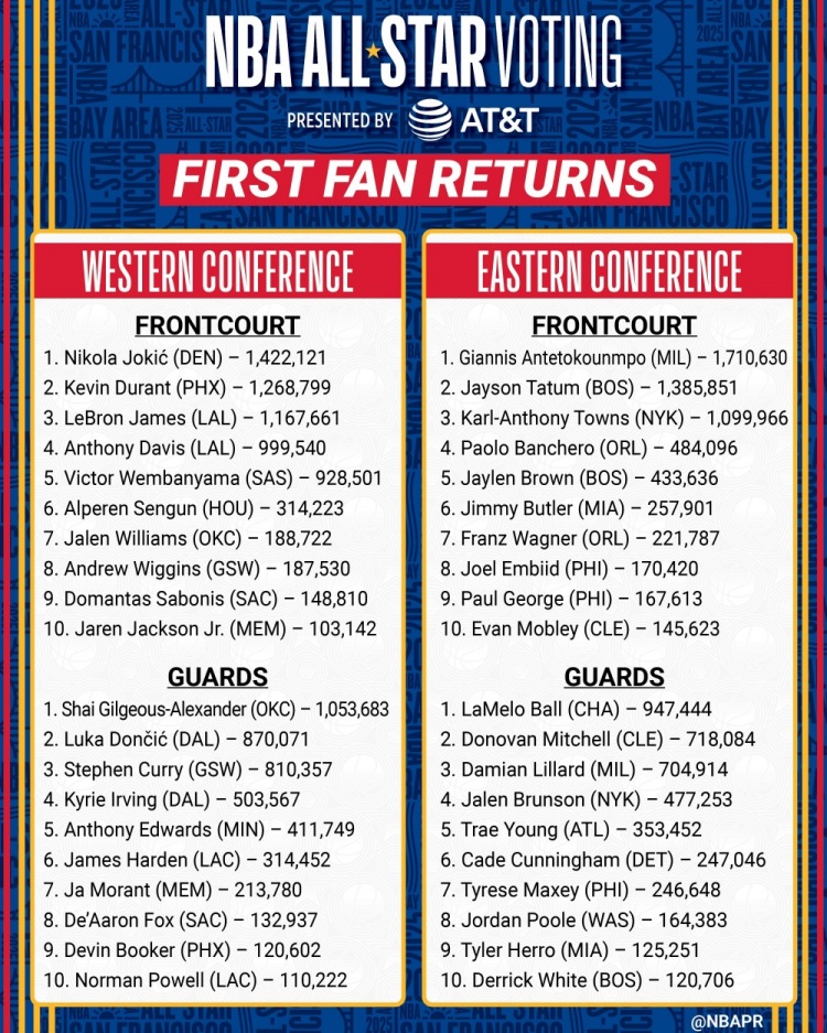 1月3日訊 NBA官方公布了2025年舊金山全明星周末第一階段球迷投票結(jié)果,其中字母哥當(dāng)選第一輪的票王。