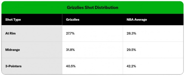 (灰熊籃下出手占比27.7%,聯(lián)盟平均28.3%;中距離出手占比31.8%,聯(lián)盟平均29.5%;三分出手占比40.5%,聯(lián)盟平均42.2%)