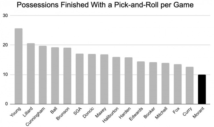 根據(jù)Synergy Sports網(wǎng)站的數(shù)據(jù),莫蘭特每場比賽只使用10次擋拆進(jìn)攻,這些進(jìn)攻最終以他自己或隊友的投籃、犯規(guī)以及失誤結(jié)束。這一數(shù)據(jù)在聯(lián)盟中排名第45位,遠(yuǎn)遠(yuǎn)落后于其他頂級控球后衛(wèi)。