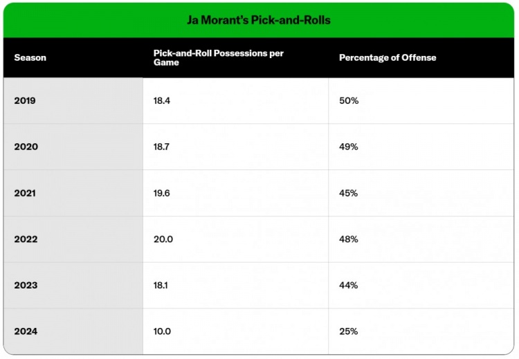 這種風(fēng)格不僅對頂級后衛(wèi)來說不尋常,而且與莫蘭特過去依賴擋拆的打法相比也發(fā)生了顯著變化。在他之前的每個賽季中,這位灰熊后衛(wèi)在擋拆使用率排行榜上都名列前茅,并且大約一半的進(jìn)攻都來自這種戰(zhàn)術(shù)類型。但到了本賽季,這一比例已經(jīng)減半。