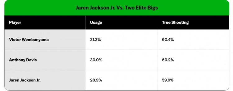 但灰熊這群大個子中最好的是小賈倫-杰克遜,他在上賽季莫蘭特缺席期間作為實際的第一選擇經(jīng)歷了成長的陣痛,但一年后作為更自然的第二選擇收獲了回報。小賈倫-杰克遜現(xiàn)在將增加的出手次數(shù)與之前的效率結(jié)合起來,以至于他的得分?jǐn)?shù)據(jù)與NBA幾位最佳大個子球員相似: