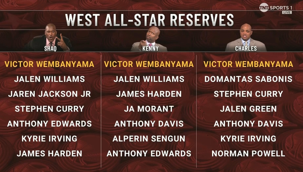 01月24日訊 2025年舊金山NBA全明星首發(fā)公布,TNT給出了三位名嘴他們心中的替補(bǔ)陣容。