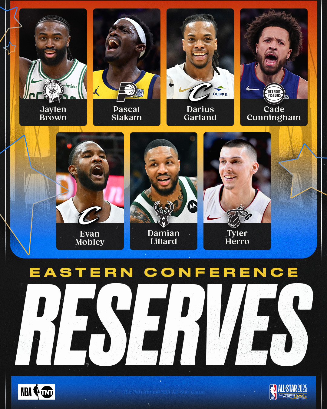 發(fā)布時間:2025年01月31日 09:20點擊:欄目:籃球新聞 01月31日訊 NBA官方公布了2025年舊金山全明星的東部替補名單,具體如下:杰倫-布朗、西亞卡姆、加蘭、康寧漢姆、莫布里、利拉德、希羅。全明星替補由30個隊的主教練投票選出!東西部各7人!今年全明星將在北京時間2月15-17日期間舉行。相關(guān)新聞: 除特別注明外,本站所有內(nèi)容均為九球直播整理排版,轉(zhuǎn)載請注明出處:東部全明星替補:布朗+利拉德+加蘭+CC+希羅+西卡+莫布里 本文標(biāo)簽: 籃球 nba 東部 76人 雄鹿 凱爾特人 籃網(wǎng) 猛龍 黃蜂 騎士 步行者 活塞 熱火 老鷹 公牛 奇才 魔術(shù) 尼克斯