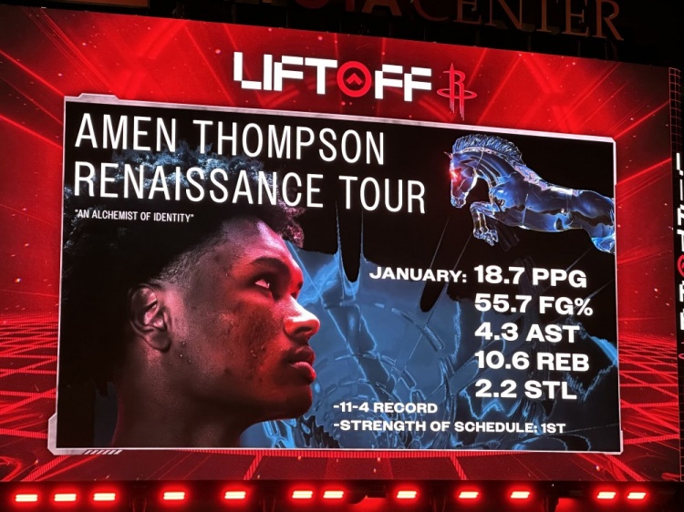 據(jù)統(tǒng)計,火箭新星阿門-湯普森在1月場均能砍下18.7分10.6籃板4.3助攻2.2搶斷,投籃命中率55.7%。