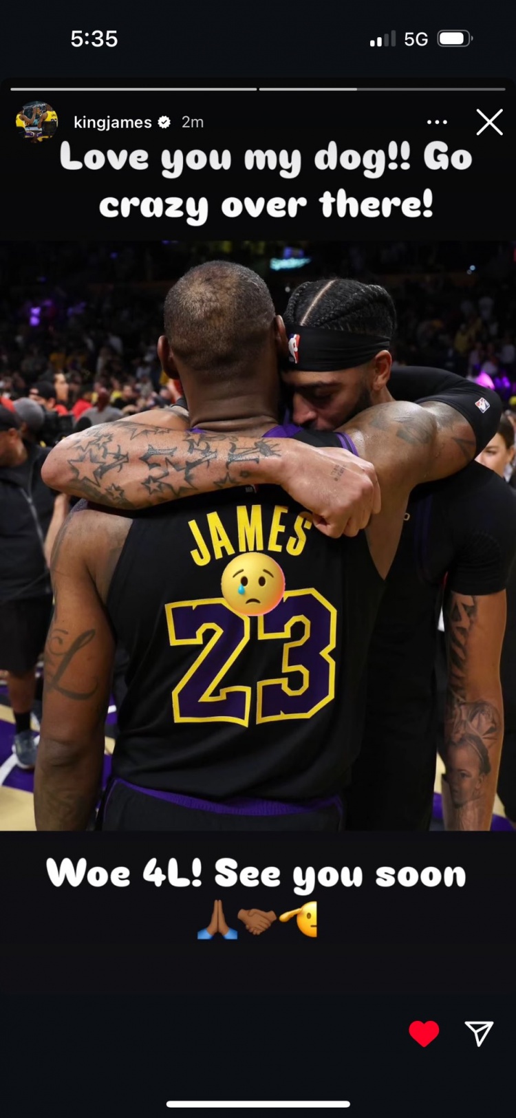 發(fā)布時(shí)間:2025年02月03日 06:51點(diǎn)擊:欄目:籃球新聞 2月3日訊 NBA歷史級(jí)重磅三方交易官宣:東契奇去湖人!濃眉前往獨(dú)行俠!詹姆斯更新IG動(dòng)態(tài)曬出自己與濃眉擁抱的合照:“愛你我的兄弟!在那里瘋狂一把 除特別注明外,本站所有內(nèi)容均為九球直播整理排版,轉(zhuǎn)載請注明出處:詹姆斯曬與濃眉擁抱合照:愛你我的兄弟!永遠(yuǎn)的痛 本文標(biāo)簽: nba 籃球 西部 湖人 詹姆斯 戴維斯 獨(dú)行俠