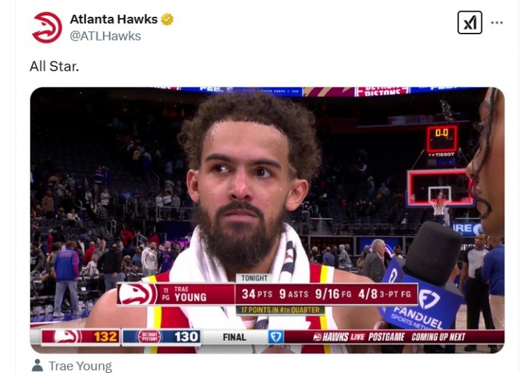 發(fā)布時間:2025年02月04日 10:52點擊:欄目:籃球新聞 2月4日訊 NBA常規(guī)賽,老鷹132-130險勝活塞。本場比賽,老鷹球星特雷-楊表現(xiàn)出色,末節(jié)命中關鍵三分反超并投進絕殺后仰跳投,在35分鐘的時間里,投籃16中9,三分球8中4,罰球14中12,砍下34分9助攻的數(shù)據(jù),不過有5次失誤5次犯規(guī)。賽后,老鷹官推曬出了特雷-楊的采訪照片,配文:“他是全明星?!?/p> 除特別注明外,本站所有內容均為九球直播整理排版,轉載請注明出處:眼神堅毅!老鷹官推曬特雷-楊采訪照:他是全明星! 本文標簽: nba 籃球 東部 老鷹 特雷-楊