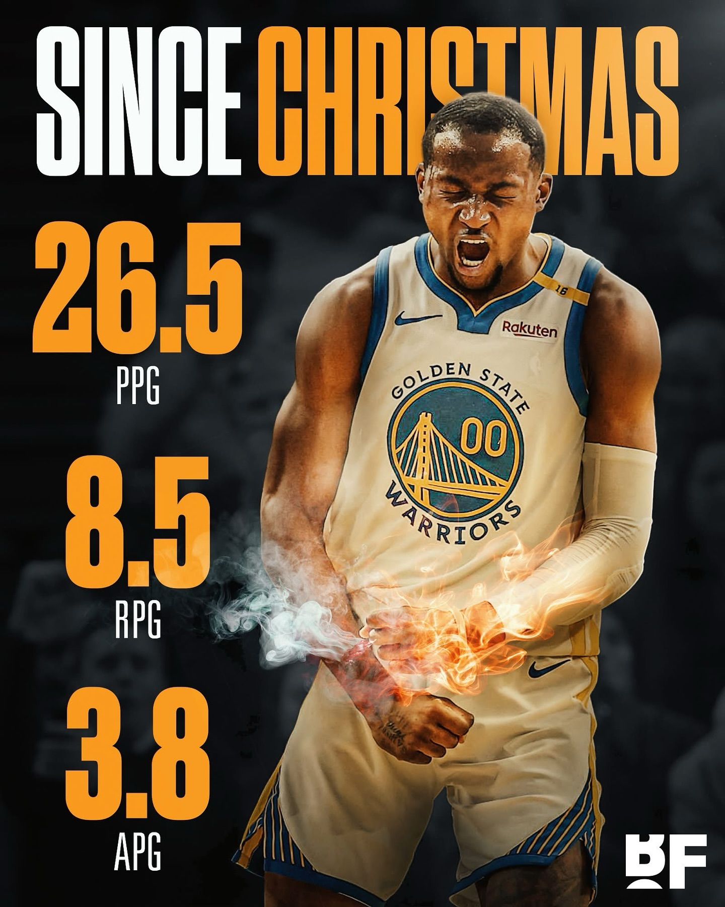 庫明加在圣誕大戰(zhàn)后的四場比賽里,場均可以得到26.5分8.5板3.8助,三項(xiàng)命中率54/39/72%。這三場比賽,庫明加皆是替補(bǔ)出戰(zhàn)。