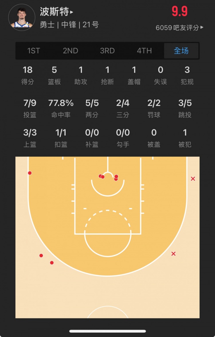 勇士52號(hào)秀 昆滕-波斯特 登場(chǎng)24.1分鐘