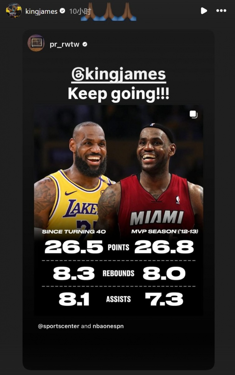 發(fā)布時間:2025年03月02日 15:55點(diǎn)擊:欄目:籃球新聞 3月2日訊 今天,詹姆斯轉(zhuǎn)發(fā)了自己40歲后和2012-13賽季的數(shù)據(jù)對比,并評論道:“ 除特別注明外,本站所有內(nèi)容均為九球直播整理排版,轉(zhuǎn)載請注明出處:40歲后場均數(shù)據(jù)對比MVP熱火詹不落下風(fēng)!詹姆斯轉(zhuǎn)發(fā): 本文標(biāo)簽: 籃球 nba 湖人 詹姆斯