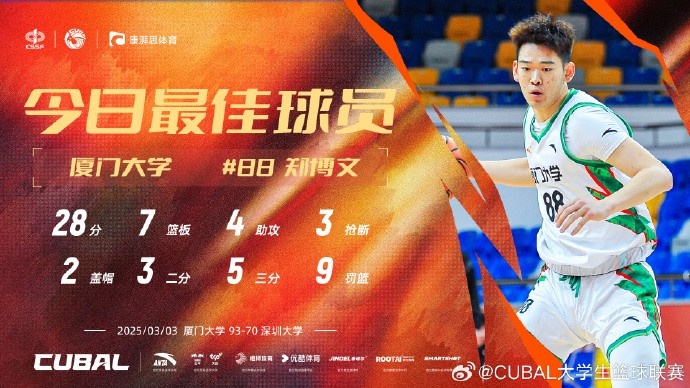 在廈門大學(xué)93-70戰(zhàn)勝深圳大學(xué)的比賽中,廈門大學(xué)中鋒鄭博文以202cm的身高優(yōu)勢(shì)的比賽中交出統(tǒng)治級(jí)表現(xiàn)!身穿88號(hào)球衣的他出戰(zhàn)35分鐘,轟下全場(chǎng)最高的28分,更以驚人效率完成籃下3投全中、三分球3投全中的"雙百發(fā)百中"表演。不僅在進(jìn)攻端勢(shì)不可擋,還摘下7個(gè)籃板(1前場(chǎng)+6后場(chǎng))并完成3次搶斷,攻防兩端全面撐起球隊(duì)脊梁。這位內(nèi)線支柱用超高的命中率和穩(wěn)定的罰球(12罰9中),為球隊(duì)勝利奠定堅(jiān)實(shí)基礎(chǔ)!