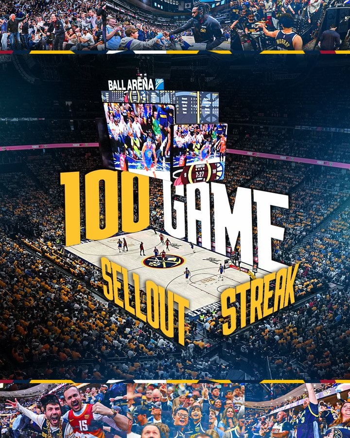 賽后,掘金官推表示,波爾球館(掘金主場)已經(jīng)連續(xù)100場比賽球票售罄。官推寫道:“謝謝你,掘金國度!”