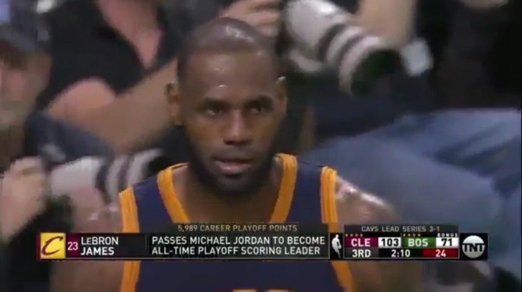 在超越賈巴爾成為常規(guī)賽歷史得分王的近六年前,詹姆斯在2017年?yáng)|部決賽第五場(chǎng)比賽中命中一記左翼三分球,成功超越喬丹成為季后賽歷史得分王。詹姆斯全場(chǎng)比賽砍下35分,率領(lǐng)騎士以135比102戰(zhàn)勝凱爾特人,幫助騎士連續(xù)第三年晉級(jí)NBA總決賽,這也是詹姆斯個(gè)人連續(xù)第七年進(jìn)入總決賽。