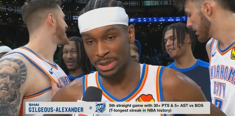 據(jù)統(tǒng)計(jì),亞歷山大對陣凱爾特人已經(jīng)連續(xù)5場拿下至少30分5助攻,追平NBA歷史紀(jì)錄!