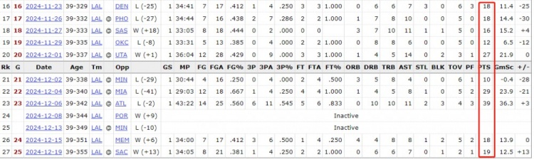 即將邁入40歲高齡的詹姆斯,終于在本賽季顯露了些許老態(tài)。雖然曾一度喊出“打滿常規(guī)賽”的口號(hào),但持續(xù)作戰(zhàn)下的力有未逮還是讓他放棄了這個(gè)想法。本賽季詹姆斯場(chǎng)均得分22.6分,這是自新秀賽季以來的最低分。最近10場(chǎng)比賽,詹姆斯有7場(chǎng)得分不足20分。