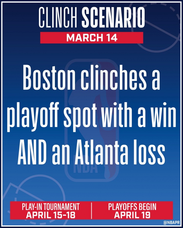 綠軍明天有可能鎖定季后賽席位,如果他們擊敗熱火,同時(shí)老鷹輸球(老鷹明天早上7點(diǎn)30分主場(chǎng)迎戰(zhàn)快船),他們將提前拿到季后賽門票。