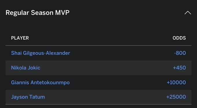 比賽結(jié)束后,MVP賠率發(fā)生變化,亞歷山大-800斷層領(lǐng)先(押800,若中連本帶利得900),約基奇則是+450(押100,若中連本帶利得550)。
