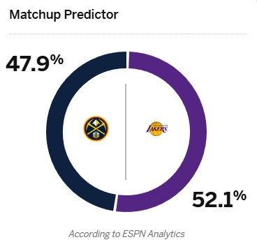 賽前,ESPN預(yù)測(cè)本場(chǎng)比賽兩隊(duì)的取勝概率:湖人52.1%、掘金47.9%。