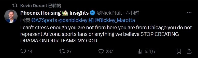 球迷一:我簡直不能更強(qiáng)調(diào)這一點(diǎn),你不是本地人,你是芝加哥人,不能代表亞利桑那州的體育迷,也不能代表我們的任何想法。停止在我們的球隊(duì)制造鬧劇吧,老天?。?/p>