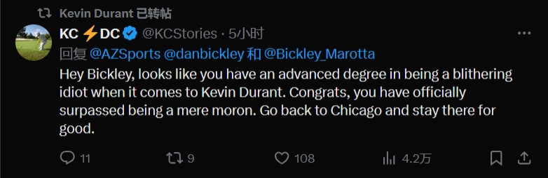 球迷三:嘿,看來你在"如何成為關(guān)于凱文-杜蘭特的胡說八道專家"這方面已經(jīng)獲得了高等學(xué)位。恭喜你,你正式超越了一個(gè)普通的白癡