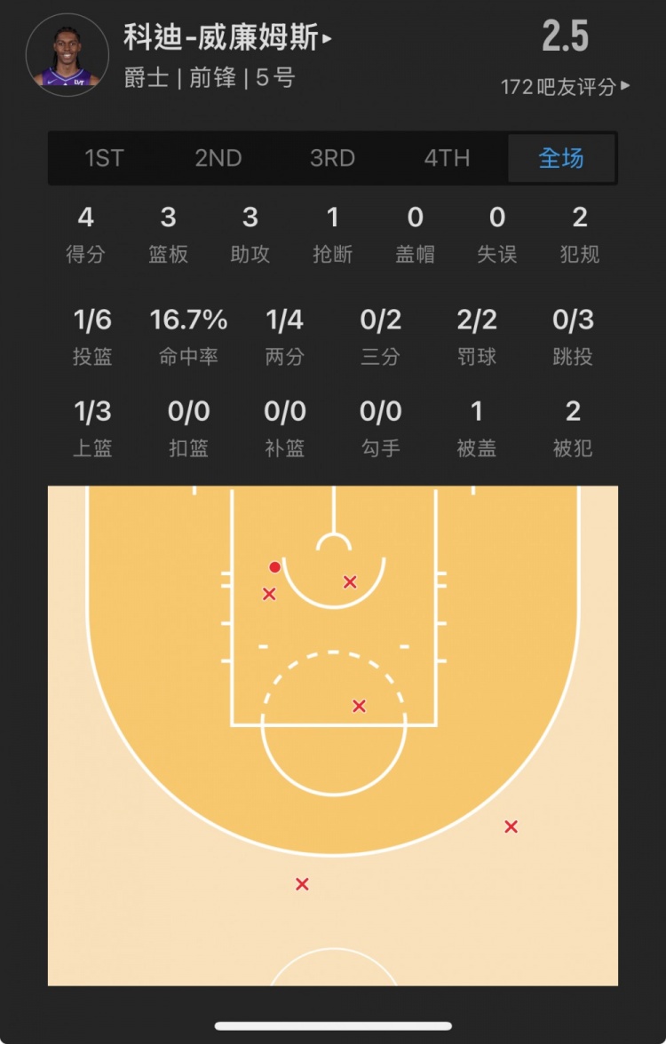 爵士10號(hào)秀 科迪-威廉姆斯 登場(chǎng)29.4分鐘