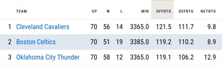 到目前為止,雷霆的進(jìn)攻效率為119.1(每百回合得分),高居聯(lián)盟第三,僅次于騎士和凱爾特人;防守效率為106.2(每百回合失分),高居聯(lián)盟第一;凈效率12.9(每百回合凈勝分)也是聯(lián)盟第一。