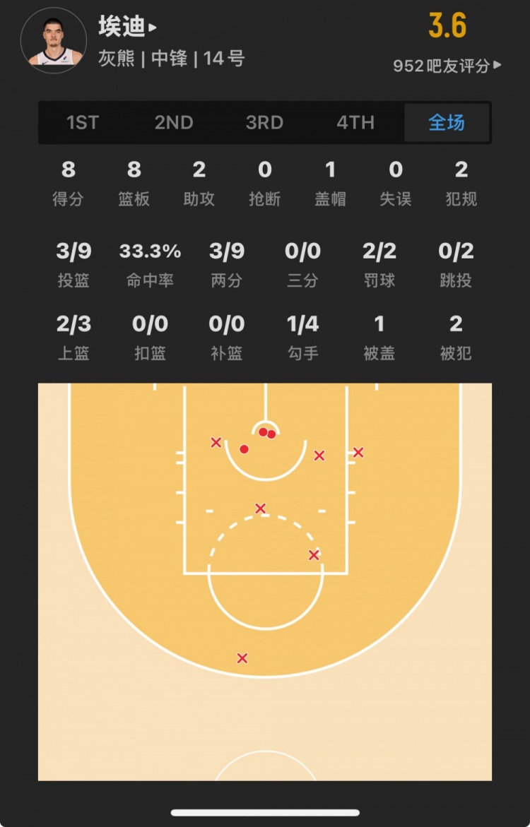 灰熊9號秀 扎克-埃迪 登場16.9分鐘