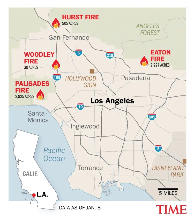 美國全國廣播公司(NBC)8日報道稱,當?shù)貢r間7日,受強勁干燥風暴“圣安娜風”影響,加州南部地區(qū)多地燃起山火,迫使至少8萬人緊急撤離,上萬棟建筑被毀。在持續(xù)強風影響下,火勢尚未得到有效控制,近30萬戶家庭8日清晨仍處于停電狀態(tài)。