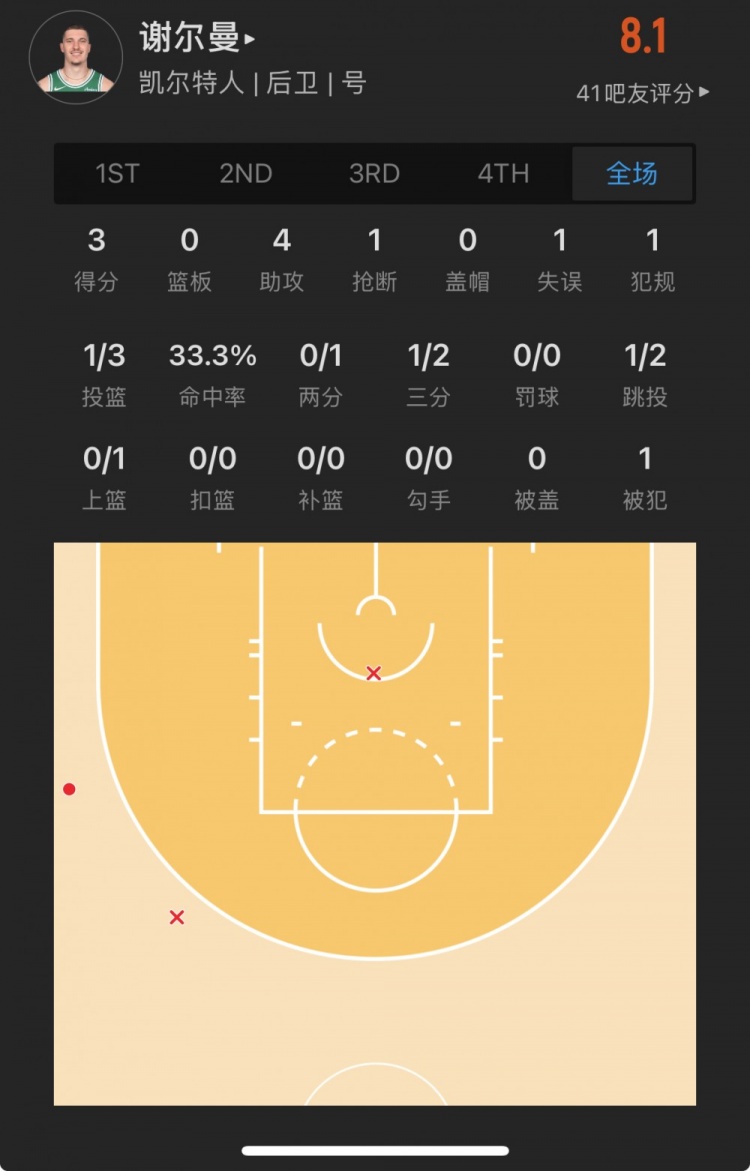 凱爾特人30號秀 貝勒-謝爾曼 登場12.7分鐘