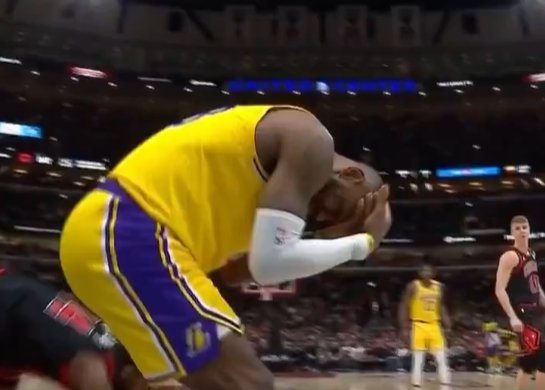 詹姆斯突破被武切維奇一掌切到頭部痛苦捂頭?♂?裁判未響哨