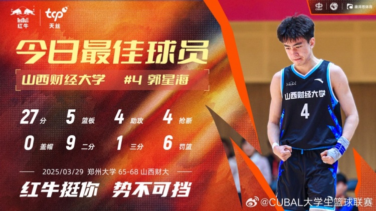 在山西財經(jīng)大學68-65險勝鄭州大學的激戰(zhàn)中,郭星海以27分5前場籃板4搶斷的全能表現(xiàn)幫助隊伍取得勝利。這位身披4號戰(zhàn)袍的鋒線悍將,在35分鐘內(nèi)交出籃下9投6中、中距離3投全中的完美答卷,更以一記冷血三分穩(wěn)定軍心。其5個進攻籃板直接轉化為8分的二次進攻,4次搶斷徹底打亂對手節(jié)奏,最終用這全能的數(shù)據(jù)為這場鏖戰(zhàn)畫下決勝注腳。