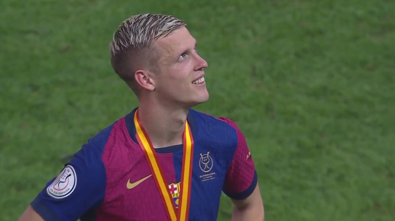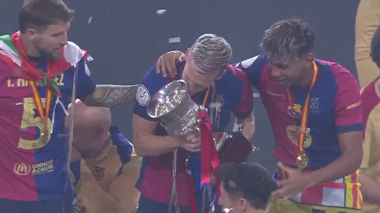 奧爾莫獲得了加盟巴薩后的首個冠軍,他親吻獎杯,臉上露出笑容。