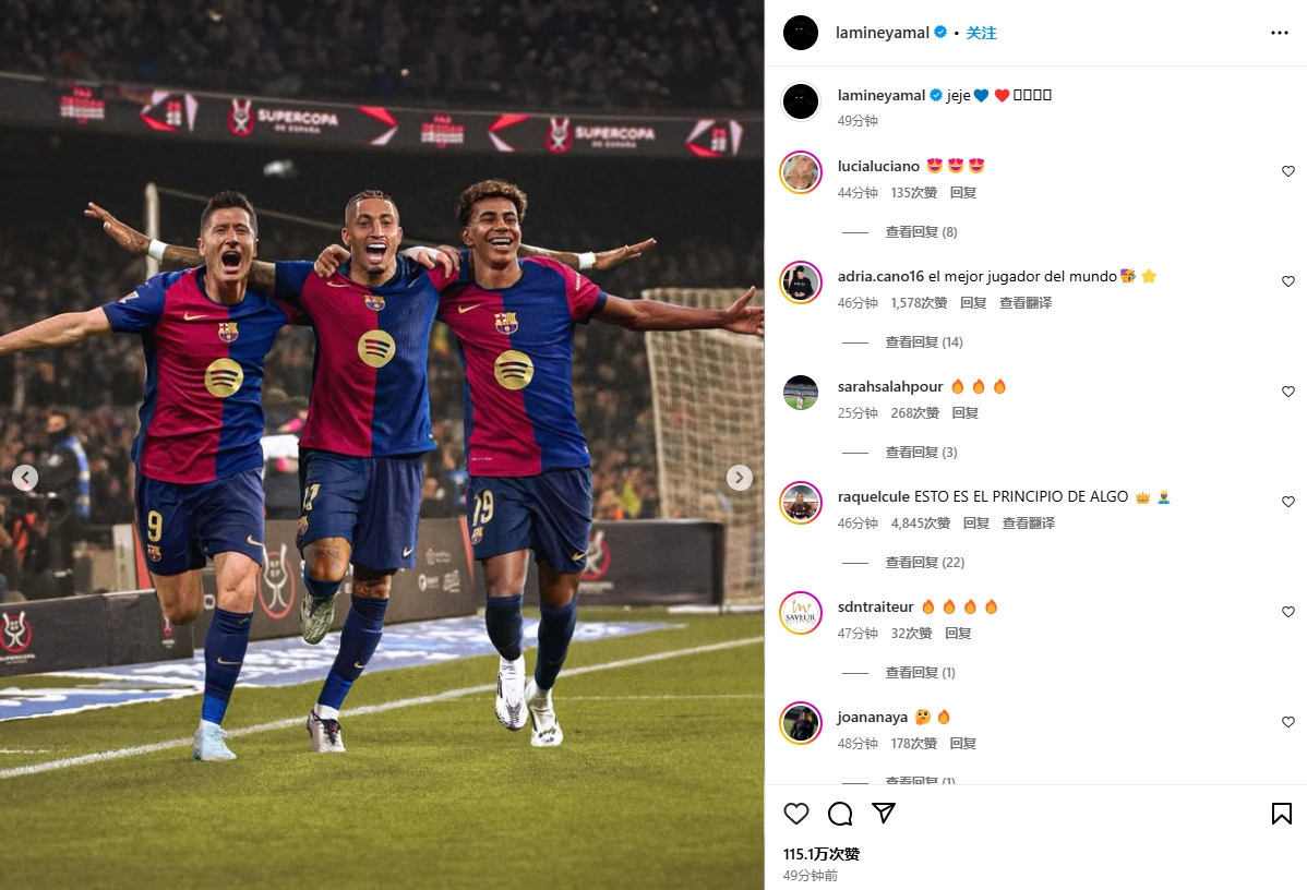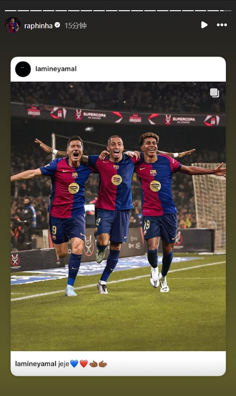 發(fā)布時(shí)間:2025年01月13日 08:50點(diǎn)擊:欄目:足球新聞 01月13日訊 西班牙超級杯決賽,巴薩5-2皇馬奪冠。賽后,亞馬爾更新社媒曬出多張照片,其中一張是萊萬、亞馬爾、拉菲尼亞慶祝照。隨后拉菲尼亞也轉(zhuǎn)發(fā)。這張照片紛紛讓網(wǎng)友們想起昔日MSN經(jīng)典慶祝瞬間。 除特別注明外,本站所有內(nèi)容均為九球直播整理排版,轉(zhuǎn)載請注明出處:太像了!亞馬爾賽后曬照,慶祝瞬間讓人想起昔日MSN三叉戟! 本文標(biāo)簽: 足球 西甲 皇家馬德里 巴塞羅那 梅西 內(nèi)馬爾