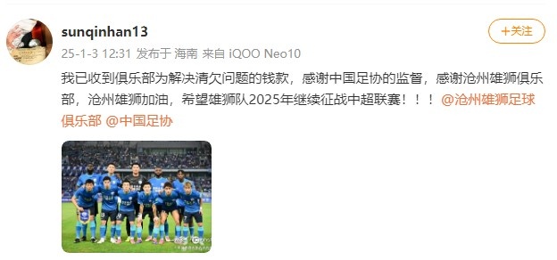 孫沁涵寫道:“我已收到俱樂部為解決清欠問題的錢款,感謝中國足協的監(jiān)督,感謝滄州雄獅俱樂部,滄州雄獅加油,希望雄獅隊2025年繼續(xù)征戰(zhàn)中超聯賽!??!”