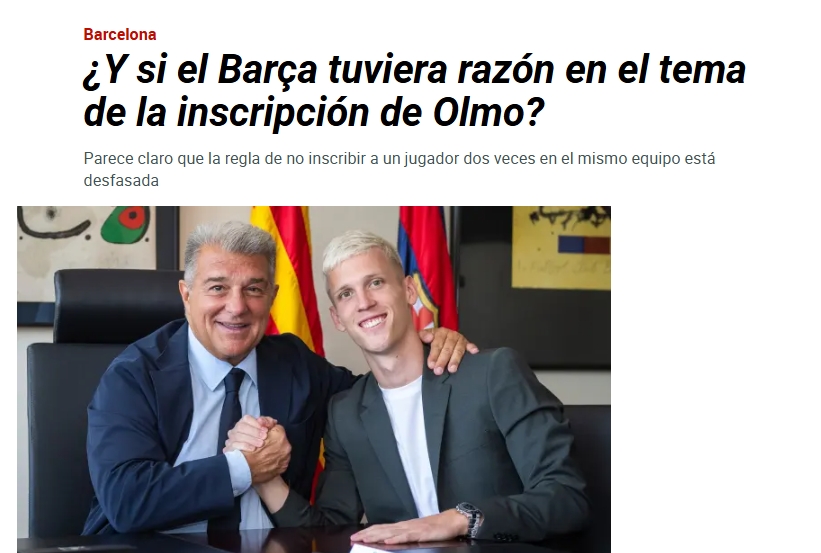 《馬卡報(bào)》標(biāo)題為“如果關(guān)于奧爾莫注冊一事巴薩是對的怎么辦?”,認(rèn)為球員不得在同一球隊(duì)兩次注冊的規(guī)則已經(jīng)過時(shí)。
