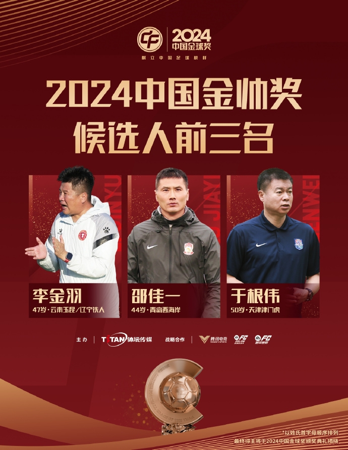 與以往一樣,2024“中國(guó)金帥”的爭(zhēng)奪異常激烈,很多候選人選票得分都超過(guò)了百分大關(guān),這是過(guò)往從未出現(xiàn)的情況。最終,李金羽、邵佳一和2023中國(guó)金帥獎(jiǎng)得主于根偉脫穎而出,前兩人都是首次入圍候選即進(jìn)入前三。率領(lǐng)山東隊(duì)奪取首屆全國(guó)青少年三大球運(yùn)動(dòng)會(huì)男足金牌的老帥殷鐵生和率領(lǐng)大連英博沖超成功的李國(guó)旭排在第四和第五名。