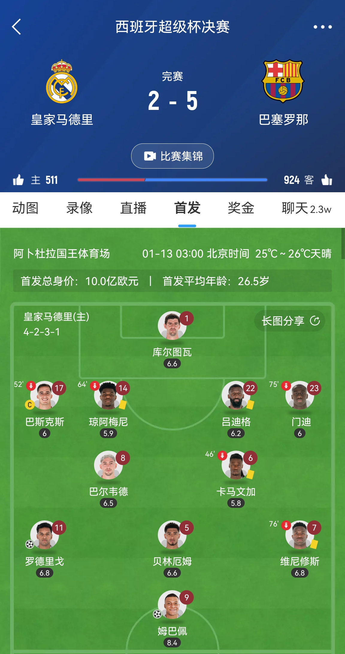 本場比賽皇馬同時首發(fā)姆巴佩、維尼修斯、貝林厄姆和羅德里戈,巴爾韋德和卡馬文加搭檔雙后腰,實戰(zhàn)中球隊在攻防轉(zhuǎn)換中多次被成功打反擊。
