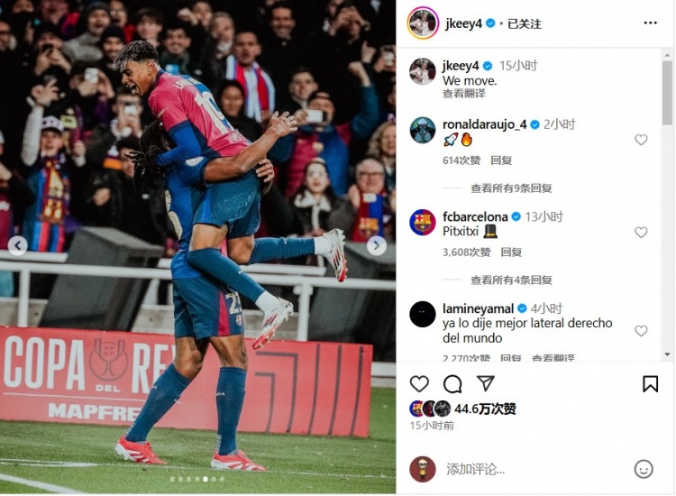 除特別注明外,本站所有內(nèi)容均為九球直播整理排版,轉(zhuǎn)載請(qǐng)注明出處:孔德社媒曬圖,亞馬爾評(píng)論:早就說(shuō)了,世界最佳右后衛(wèi)!