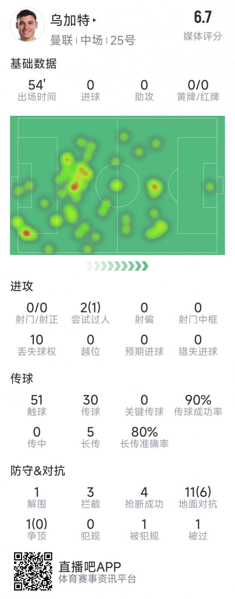 1月17日訊 在本輪英超曼聯(lián)對(duì)陣南安普頓的比賽中,烏加特首發(fā)出戰(zhàn),以下為他在本場數(shù)據(jù):