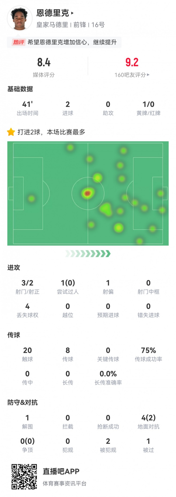 1月17日訊 國(guó)王杯1/8決賽,皇馬5-2加時(shí)戰(zhàn)勝塞爾塔。此役18歲恩德里克替補(bǔ)登場(chǎng)41分鐘,加時(shí)連進(jìn)兩球。球員全場(chǎng)重點(diǎn)數(shù)據(jù)如下↓