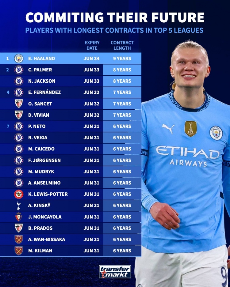 1月17日訊 曼城官方宣布與哈蘭德續(xù)約至2034年,德國轉(zhuǎn)會市場列出了五大聯(lián)賽球員目前的合同年限,并列出榜單,哈蘭德9年居首,切爾西9人上榜。