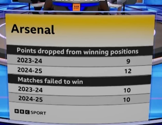 阿森納本賽季英超領(lǐng)先情況下丟掉12分,已超過(guò)上賽季(9分)。