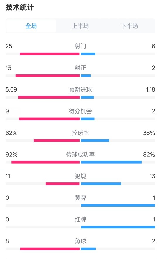 發(fā)布時(shí)間:2025年01月20日 01:50點(diǎn)擊:欄目:足球新聞 1月20日訊 西甲第20輪,皇馬主場4-1戰(zhàn)勝拉斯帕爾馬斯。全場比賽數(shù)據(jù)如下(皇馬在前):射門25-6射正13-2預(yù)期進(jìn)球5.69-1.18進(jìn)球機(jī)會9-2控球率62%-38%傳球成功率92%-82%犯規(guī)11-13黃牌0-1紅牌0-1角球8-2 除特別注明外,本站所有內(nèi)容均為九球直播整理排版,轉(zhuǎn)載請注明出處:皇馬4-1拉斯帕爾馬斯數(shù)據(jù):射門25-6,射正13-2,控球率62%-38% 本文標(biāo)簽: 足球 西甲 皇家馬德里 拉斯帕爾馬斯