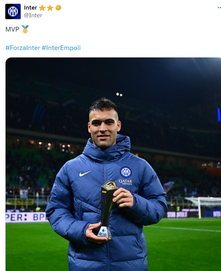 此役勞塔羅禁區(qū)外世界波破門,這位阿根廷前鋒當(dāng)選意甲官方本場比賽最佳球員。