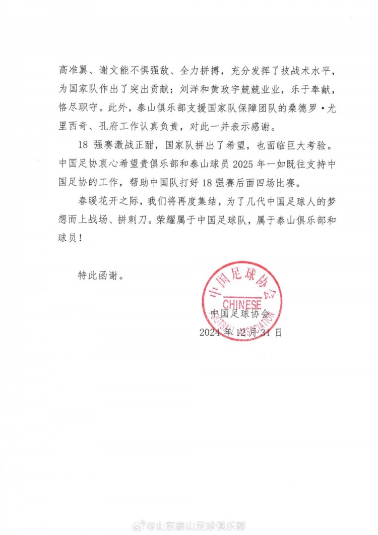 1月3日訊 為感謝山東泰山俱樂部對于國家隊的大力支持,中國足協(xié)向山東泰山俱樂部發(fā)去了感謝信。