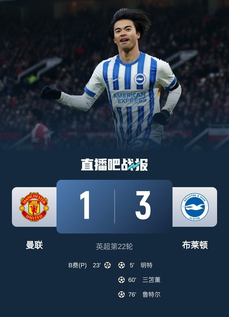 本輪英超,曼聯(lián)1-3不敵布萊頓,布萊頓方面明特、三笘薰和魯特爾進球,B費點射但于事無補。