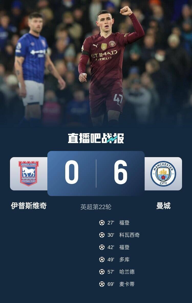 曼城本輪6-0大勝伊普斯維奇!福登兩射一傳,曼城此役后已經(jīng)五輪不?。?/p>